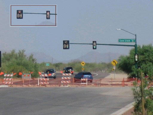 Original photo shows traffic lights green, inset shows them red. This is the intersection of Desert Peak Parkway and Cave Creek, and the traffic lights seem to be working, so... |